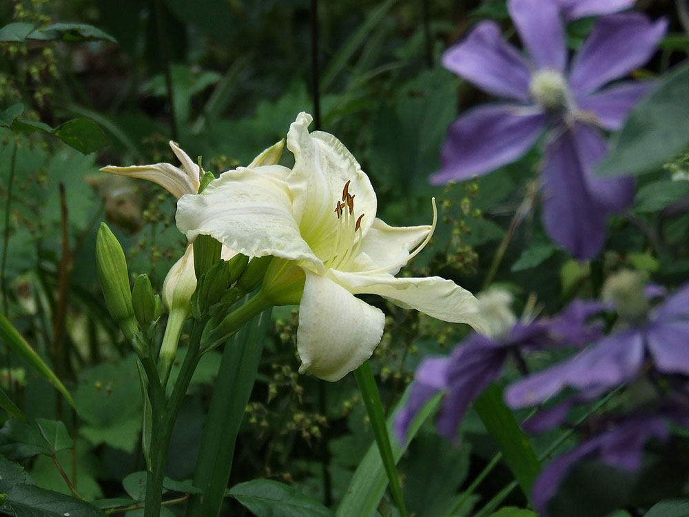 ......namenlose Taglilie die aus dem hohen Norden zu mir kam. Ich habe sie "Carmen 's Lilie" getauft nach der Gartenfreundin von der ich sie bekam. Daneben die Staudenclematis "Arabella" in einem sehr schönen Blau.